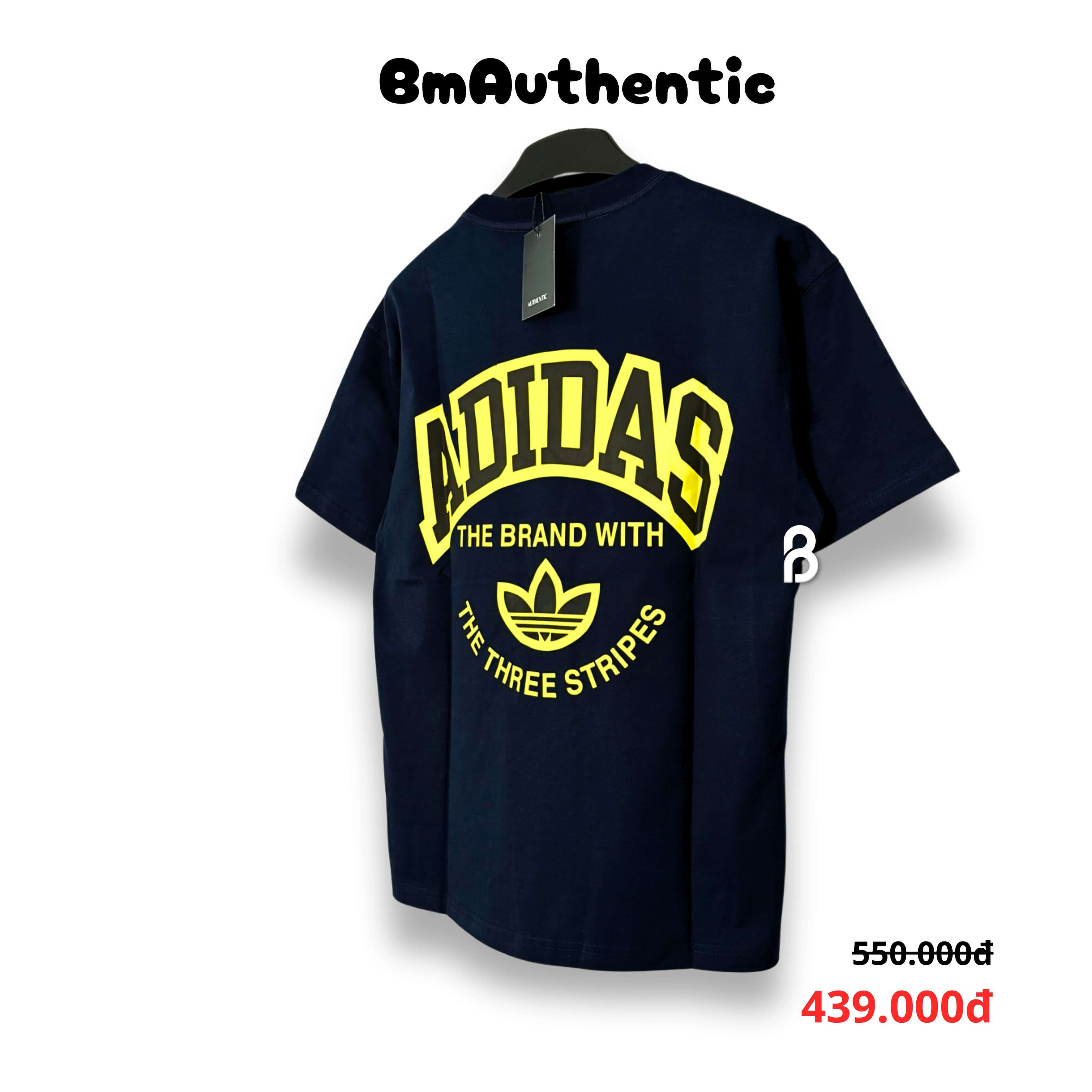 - Thiết kế: Logo "Adidas" in nổi bật với màu vàng, kết hợp dòng chữ "The Brand With The Three Stripes" tạo điểm nhấn thể thao cá tính.