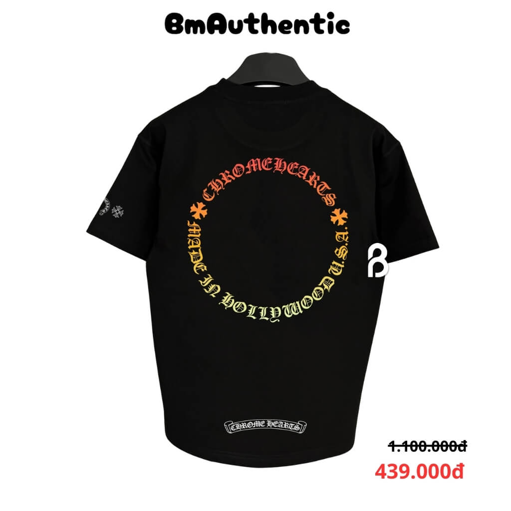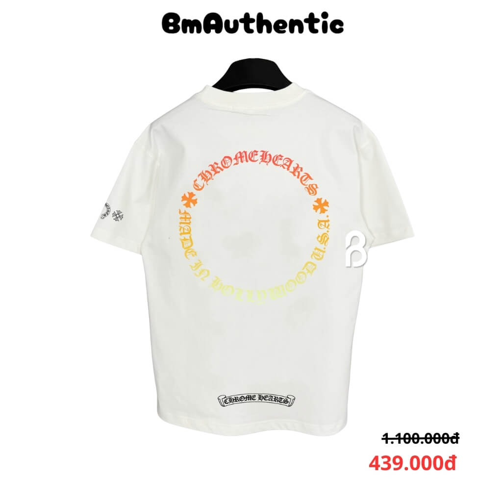 THÔNG TIN SẢN PHẨM - CHẤT LIỆU – Cotton 100% cao cấp, vải dày dặn và mềm mịn, thấm hút tốt, thoáng khí, giữ form chuẩn sau nhiều lần giặt. – THIẾT KẾ – Mặt trước in mini logo Chrome Hearts tinh tế cùng chi tiết tag đặc trưng; mặt sau nổi bật với họa tiết vòng tròn CHROME HEARTS MADE IN HOLLYWOOD phối màu chuyển sắc cam - vàng cực nổi bật, tạo điểm nhấn streetwear độc đáo. – KIỂU DÁNG – Form rộng Unisex thoải mái, dễ phối với quần jeans, jogger, short; phù hợp đi chơi, dạo phố, phong cách thời trang đường phố năng động.