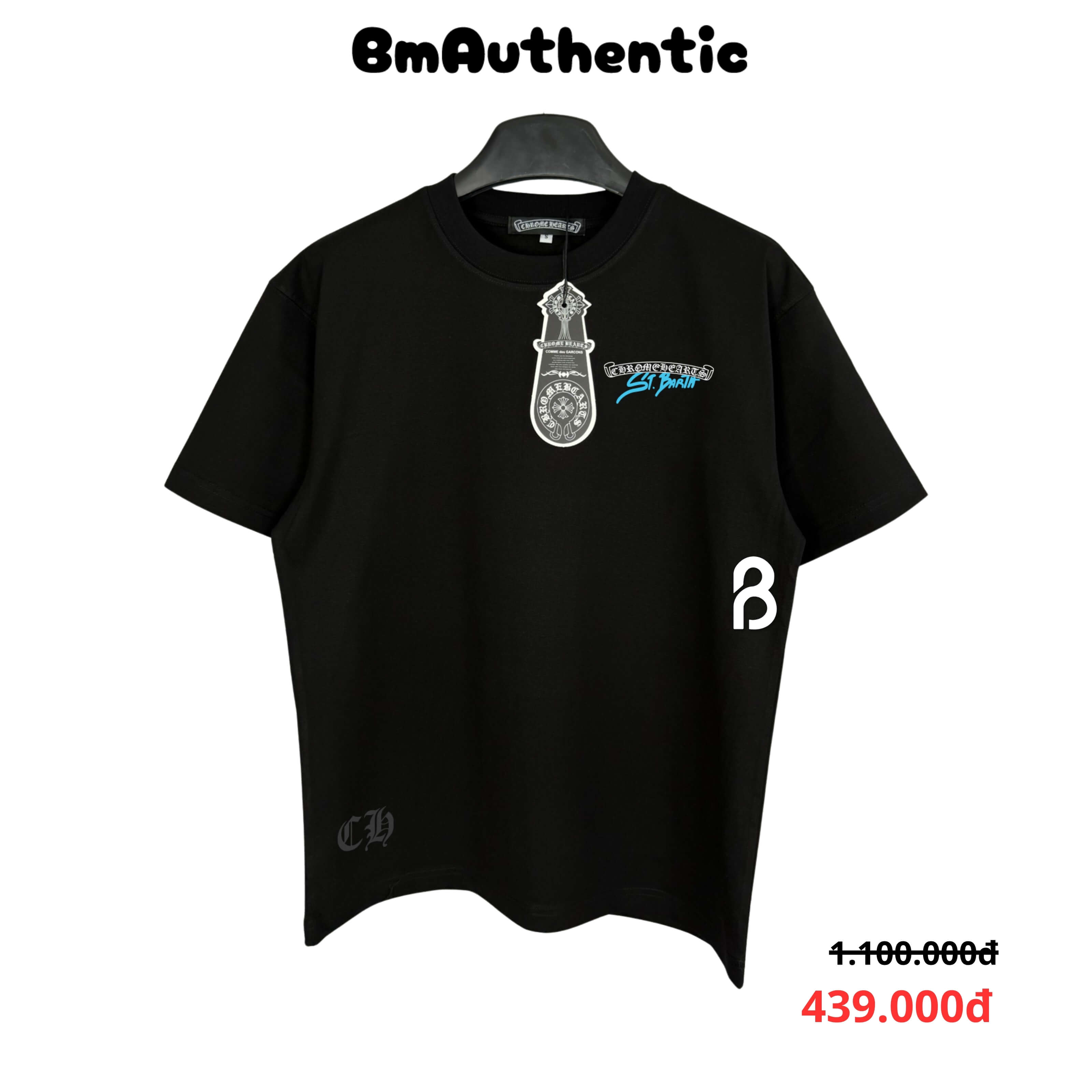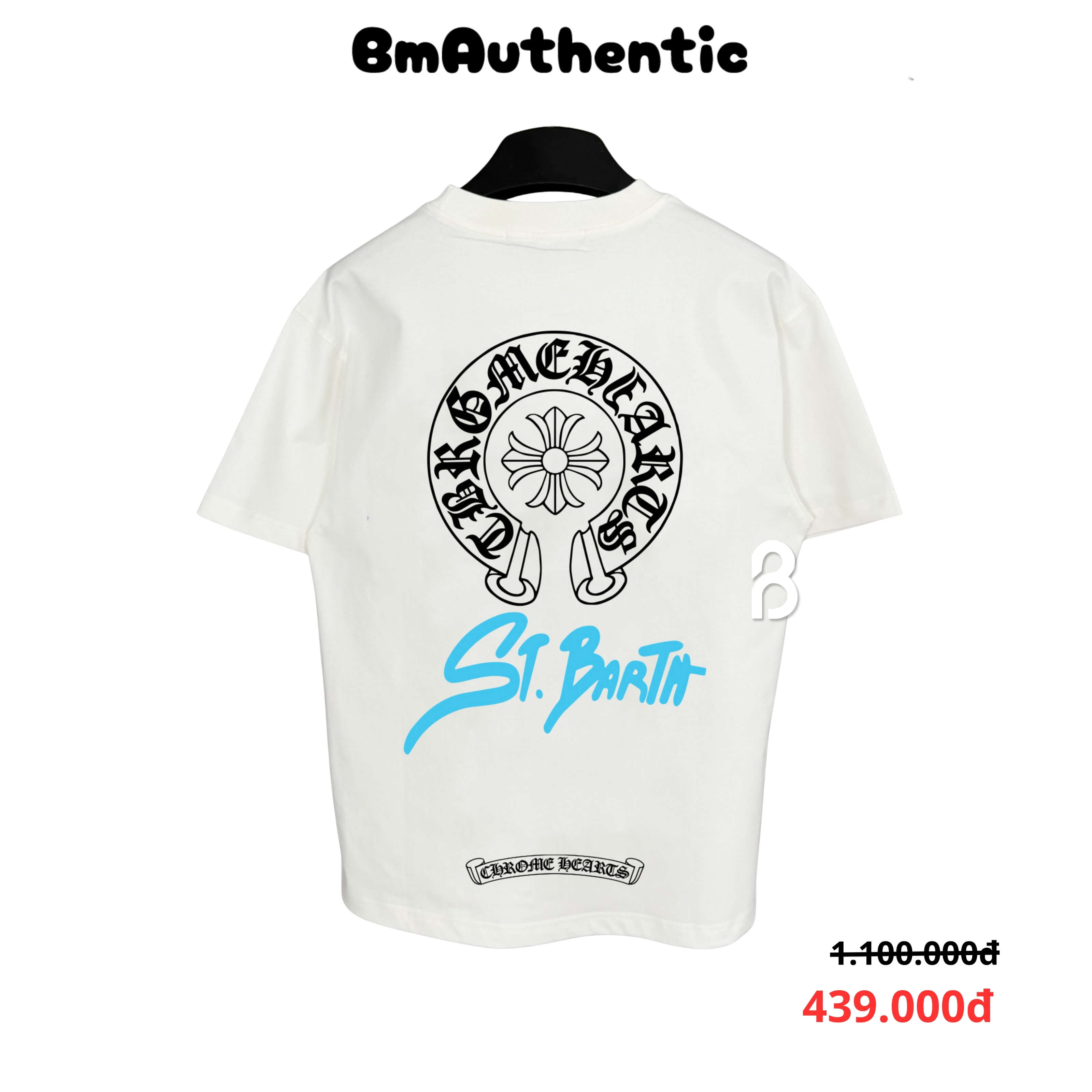THÔNG TIN SẢN PHẨM - CHẤT LIỆU – 100% cotton cao cấp, bề mặt vải mịn, thấm hút tốt, co giãn nhẹ, mặc thoải mái cả ngày dài – THIẾT KẾ – mặt sau in đồ họa Chrome Hearts Round Horseshoe đặc trưng kết hợp chữ St. Barth xanh dương phong cách lettering độc quyền; mặt trước in logo mini cùng tone, đi kèm chi tiết tag khóa đặc trưng, form áo tôn dáng và đậm chất streetwear – KIỂU DÁNG – Form rộng unisex dễ phối đồ, phù hợp phong cách casual, streetwear và daily wear.