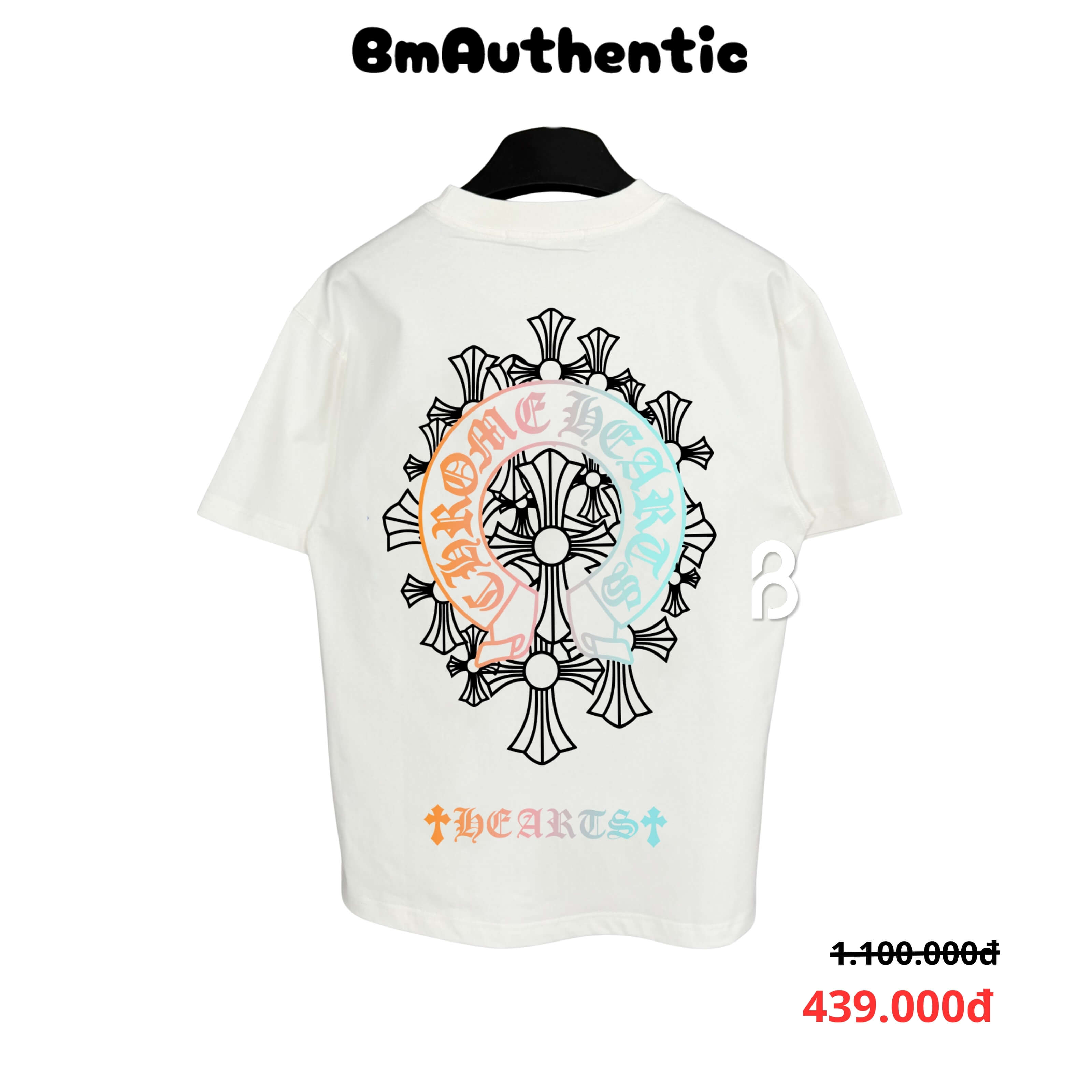 THÔNG TIN SẢN PHẨM - CHẤT LIỆU – Cotton cao cấp mềm mịn, thoáng khí, độ bền cao, giữ form đẹp khi mặc – THIẾT KẾ – Logo Chrome Hearts phối màu gradient cam–xanh độc đáo, họa tiết Cross lớn phía sau, mặt trước in mini tinh tế – KIỂU DÁNG – Form rộng unisex thoải mái, dễ phối đồ, phù hợp phong cách streetwear hiện đại.