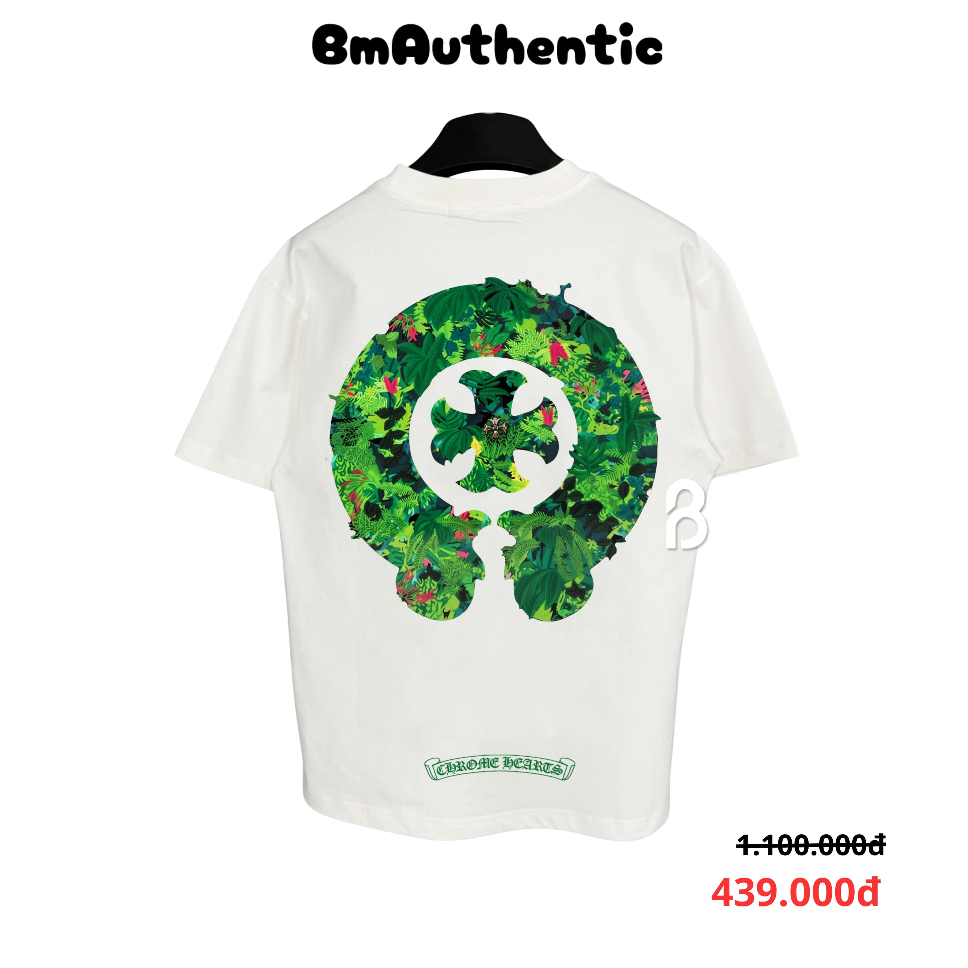 THÔNG TIN SẢN PHẨM - CHẤT LIỆU – Cotton cao cấp mềm mịn, thoáng khí, thấm hút tốt, giữ form áo ổn định khi mặc lâu dài – THIẾT KẾ – Hình in Chrome Hearts chủ đạo kết hợp hiệu ứng lá rừng Jungle xanh nổi bật, phong cách độc đáo – ấn tượng; mặt trước có logo mini tinh tế, mặt sau họa tiết lớn phủ màu xanh lá tạo điểm nhấn mạnh mẽ – KIỂU DÁNG – Form rộng unisex thoải mái, phù hợp mọi vóc dáng và phong cách streetwear hiện đại.