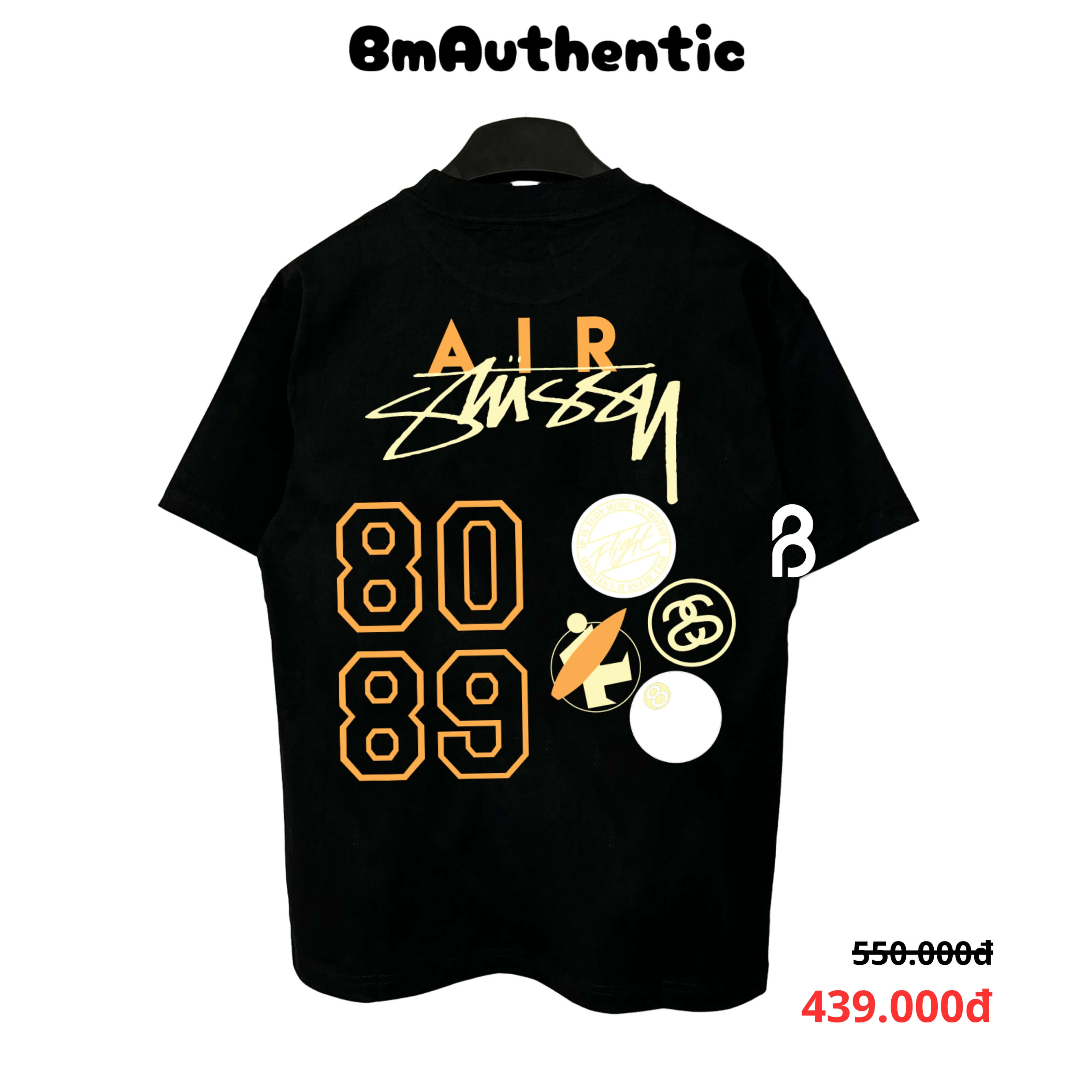 THÔNG TIN SẢN PHẨM - CHẤT LIỆU – Cotton cao cấp, dày dặn, mềm mịn và thoáng khí, đảm bảo form áo đứng dáng và bền màu sau nhiều lần giặt. – THIẾT KẾ – Mặt trước in logo Stussy vàng pastel tối giản; mặt sau nổi bật với dòng chữ “AIR STUSSY” cùng số hiệu “8089” và các patch logo tròn đặc trưng mang phong cách retro streetwear đậm chất Mỹ. – KIỂU DÁNG – Form rộng unisex trẻ trung, phù hợp cho cả nam và nữ, dễ phối với quần jean, short hoặc layer cùng áo khoác street style.